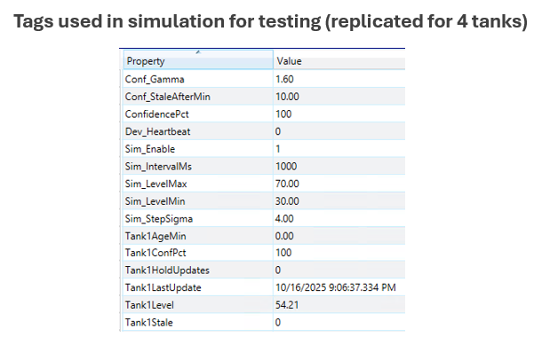 | Implementation Approach | Four simulated tanks generate random level values within a configurable range. Each tank includes a Hold Updates toggle that pauses data changes, allowing its Age (min) to increase. A decaying confidence function reduces reliability as the age approaches a configurable threshold (Conf_StaleAfterMin). |